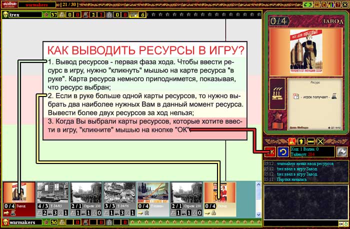 С чего начать / Сражение: вывод ресурсов Игрок в начале каждого своего хода может ввести в игру не более двух карт ресурсов. В дальнейшем ресурсы используются для строительства военных подразделений и использования некоторых свойств подразделений - например, залпа "Катюши". Таким образом, чем больше у игрока ресурсов, тем лучше. Всего существует три вида ресурсов: склады, заводы и топливо. Если в руке у игрока более двух карт ресурсов, важно выбрать, какие из ресурсов требуются в первую очередь. Так, пехота для постройки требует обычно склады и заводы в равном количестве, но не требует топливо. Бронетехника наоборот - стоит мало складов, но много заводов, и всегда требует для ввода в игру топливо. ![]() |