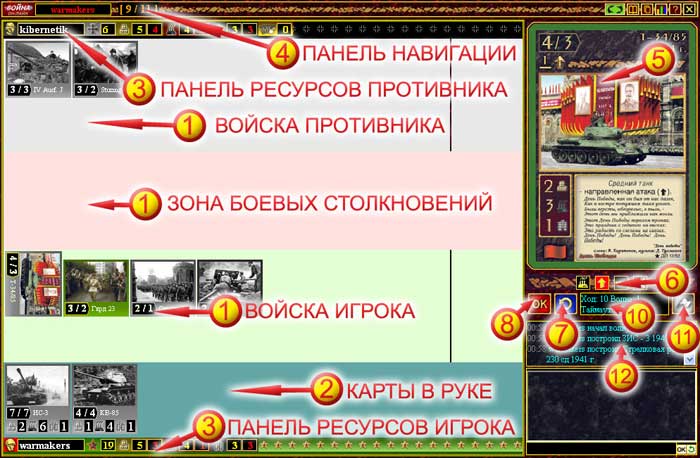 Панель навигации. Расположена в верхней части экрана. На ней указан "Ник" игрока, а также расположены кнопки: "обновить" - позволяющая принудительно обновить информацию об игре в любой момент времени, "форум" - открывающая страницу форума, где общаются игроки, "каталог карт" - описание карт, доступных в игре на данный момент, "правила игры" - полный текст правил, "справка" - информация о текущей фазе хода, "выход" - выход из игры