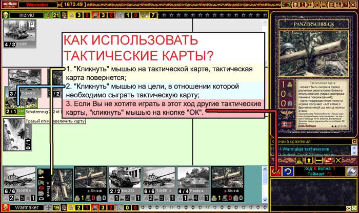 С чего начать / Сражение: тактические карты С помощью тактических карт в игре отображаются внезапные изменения боевой обстановки, особые приемы боя, а иногда и события исторического значения, способные в той или иной степени повлиять и на боевые действия отдельных дивизий и корпусов. Тактические карты всегда играются "из руки", немедленно оказывают предусмотренное в их тексте воздействие, после чего помещаются в потери. ![]() Тактическая карта - всегда неожиданность для противника. Тем не менее, анализируя боевую обстановку - количество карт на руке у оппонента, неиспользуемые им в течение хода ресурсы, - игрок может предугадать отыгрыш этих карт. Некоторые тактические карты, например, русский "Снайпер", используются в фазу атаки при назначении атакующих отрядов. Тактические карты "Меткий выстрел" и "Panzerschreck" могут быть сыграны непосредственно перед расчетом результатов боевого столкновения, когда все атакующие и блокирующие подразделения уже назначены. Для этих действий предусмотрена отдельная фаза хода. Одинаковые тактические карты не могут изменять характеристики подразделения (сила атаки/сила защиты) несколько раз в течение одного хода. |